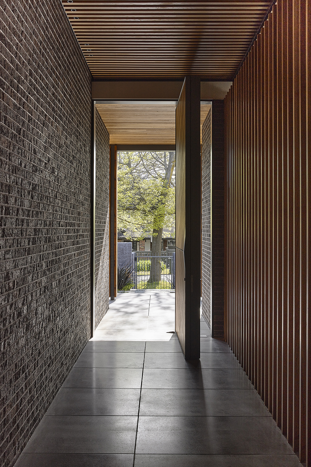 Located in a heritage area, this home required a sensitive response to its context, not to mention nimble planning, as the site itself is very compact. The result is a whole lot of house on a small plot, with a second storey integrated into the roof, creating an undulating form that engages with the side laneway. Landscaping in the entry landing area softens the building, as well as connecting it to the garden, while a material palette of dark heritage pressed brick, slate and grey stucco complement its urban aesthetic. Inside, the kitchen is finished in solid timber, as is the three-storey staircase, and dark brick is peppered throughout, from the entry wall to the fireplace chimney.