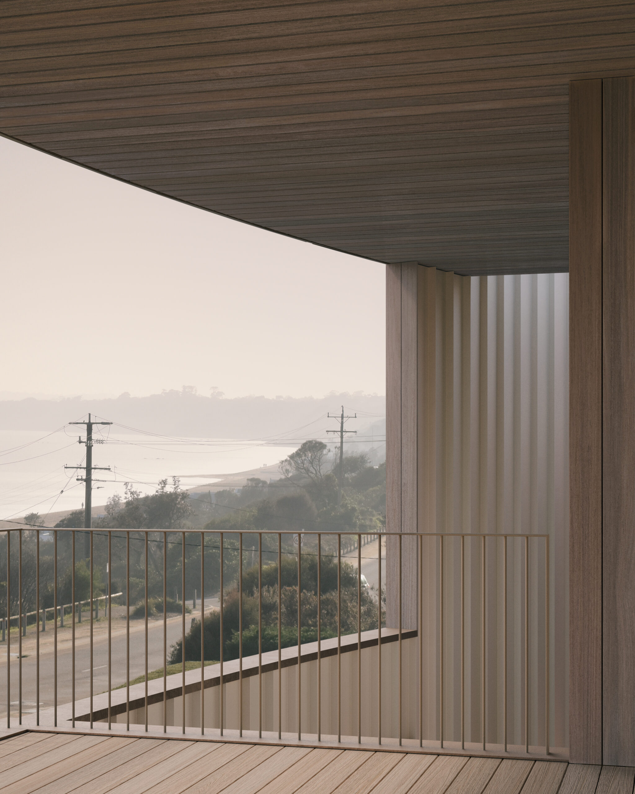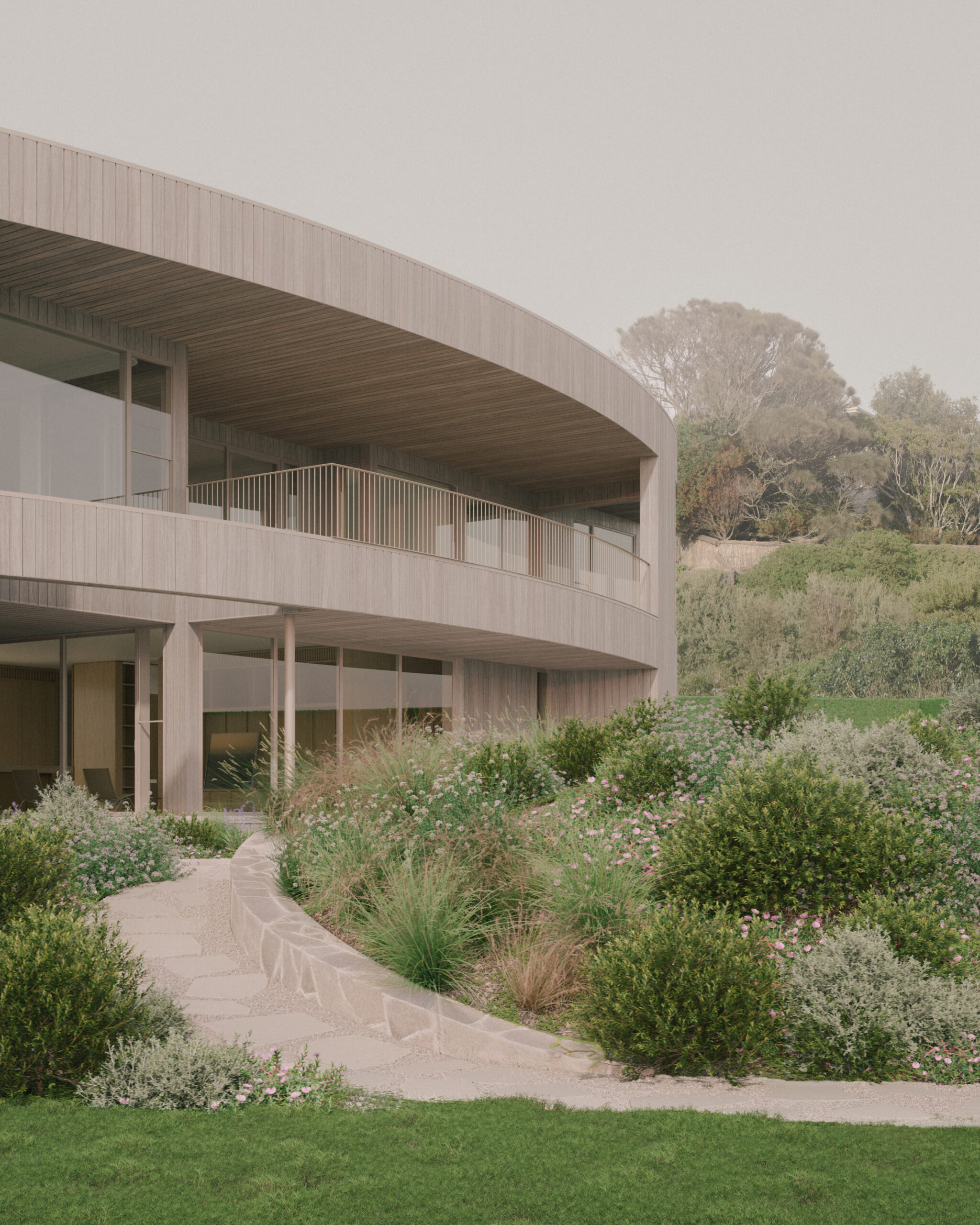At its core, the design balances openness with protection. A simple, rectilinear, light-framed form is embraced by an elliptical timber shroud, blackbutt externally and a soft off-white metal internally, forming a continuous sheltering arm around the home. This crafted envelope tempers the coastal conditions, encouraging the strong south-westerlies to slip past its curvature and creating calm, recessed zones for indoor and outdoor living.